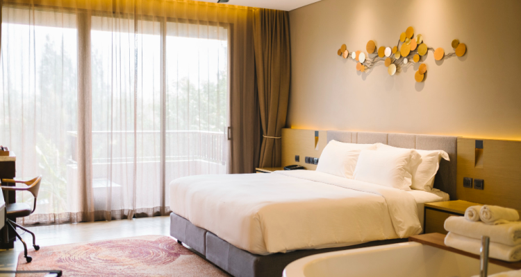 The room is decorated in a modern style with neutral colors. The bed is made with luxurious bedding and the desk has plenty of space to spread out work materials. The high-speed internet access is perfect for staying connected with clients or colleagues. The microwave and fridge are convenient for storing snacks and drinks. The 37-inch TV provides entertainment options and the Keurig coffee maker is a great way to start the day.